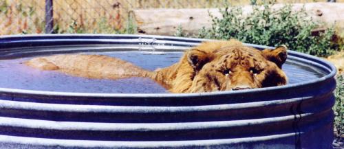 And speaking of water, in summer, Hobbs would try to 'hide' in the water so he could surprise you and get you all wet. The look on his face when he was in the water was, 'What cat? No, there's no 1,000 pound cat hiding in this water!' Both keepers and visitors were recipients of these 'baths'.