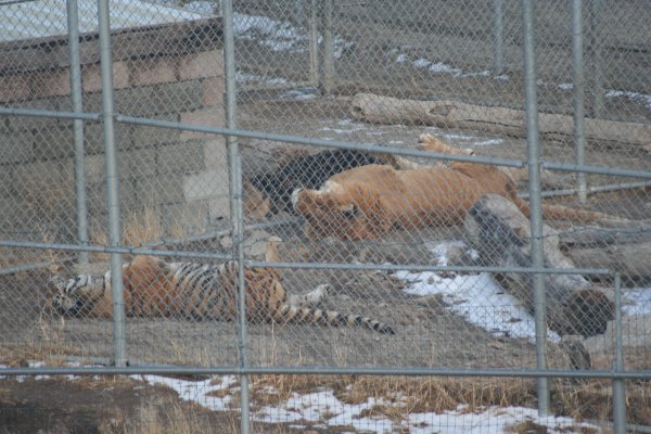 In late 2002, we had a terrible windstorm in the Reno area. The zoo is in one of the windiest areas of Reno. I remember working at the zoo that day. We saw an emu almost fly. A tractor-trailer overturned in front of the zoo. I watched the shingles blowing off the roof of my house, as all the neighbor's horses ran through my yard. (I live next door to the zoo.) We struggled to do any zoo chores that day at all. I finally went home, hoping and praying I would still have power. I happened to look out the window that overlooks the zoo, and saw an amazing sight. Hobbs and Tasha were out in the exercise run. (not in their cozy house!) Hobbs was laying on his back, slowly opening and closing his big mouth. He must have really enjoyed how that stiff wind was blowing on his body! There was just enough light left that I was able to get a picture of him doing this.