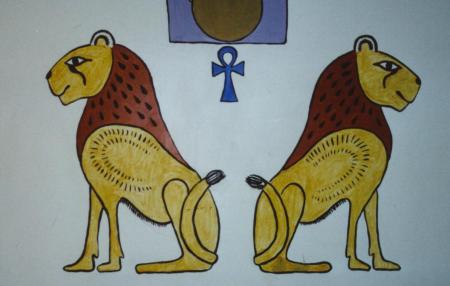 With the Egyptian theme of Isis Oasis, there were plenty of examples of lion art to be found there. There were two beautiful lion statues in the dining hall. A pair of Egyptian lioness heads were on the stage of the conference center. There was also two murals of the Aker Lions. The Aker lions, in Egyptian mythology, guard the past and the future!
