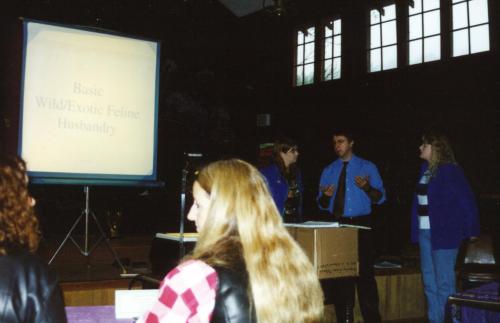 The first three units were taught before lunch. The rest were taught after lunch. The behavior training unit was especially interesting, as we had cats available to demonstrate the techniques with. However, the cats weren't very cooperative in front of such a large group. So, a human volunteer was chosen to be trained in an unknown behavior using 'clicker training'. The idea of clicker training goes like this: Since cats have such a short attention span, you try to get them to do something you want. The moment they do what you want, you click a mechanical clicker. You then give them a food treat. Pretty soon, the cat will know that the desired behavior is accompanied by a 'click', and a treat immediately afterwards.