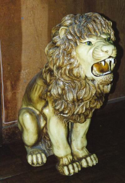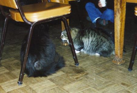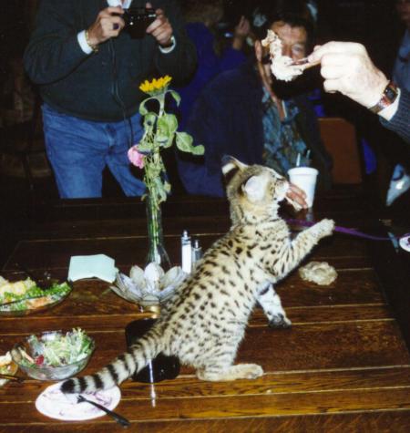 Dinner was very festive that night, and it was the only time that meat was served (Chicken quarters). During dinner, a small exotic cat, a 'Ser-gle' was brought in the room. Everyone enjoyed the cat, and the 'ser-gle' (More on the name later) had fun trying to snag a chicken leg! There were also two huge domestic cats who hung around the people constantly, looking for attention. They were both Maine Coon Cats. After many hours of after-dinner conversation, Dale and I went back to the lodge. There, we each talked for several more hours with other cat people in a common-room. I finally ended up finding a lion person, a woman who trained lions and tigers for movie work.