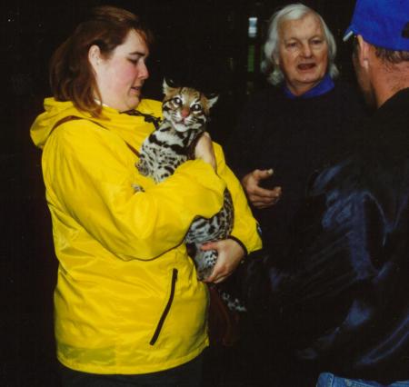 Of course, the main reason to be here, though is Ocelots. (Notice the pretty pink nose. This is 'Hotep', a young ocelot. This was a sweet, very handlable cat that looked for any part of your hand to suckle!) After watching Dale learn what to do and what not to do, I finally got my turn to handle an ocelot. My turn was very short-lived, though. It discovered a new toy in my coat pocket, a leather glove. It was not intent on giving it back, and the glove now has permanent teeth marks on it! (I did enjoy the experience!)