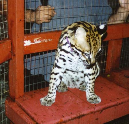 Of course, the main reason to be here, though is Ocelots. (Notice the pretty pink nose. This is 'Hotep', a young ocelot. This was a sweet, very handlable cat that looked for any part of your hand to suckle!) After watching Dale learn what to do and what not to do, I finally got my turn to handle an ocelot. My turn was very short-lived, though. It discovered a new toy in my coat pocket, a leather glove. It was not intent on giving it back, and the glove now has permanent teeth marks on it! (I did enjoy the experience!)