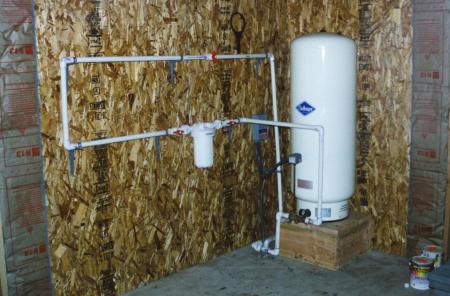 I contemplated the well tank installation long and hard. It would work as installed, but there was no provision for adding even a sediment filter. The control box for the pump motor was mounted on the outside wall, directly behind the electric service entrance. Thservice entrance. There was not even a pipe nipple between the electric service and the control box. Furthermore, the control box would be buried in any insulation I installed. Last, but not least, there was no clue as to which way the water flowed through all the plumbing.