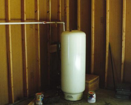 Before I could start any work, I got paged to come into work. This kind of got me off to a slow start. This thrslow start. This threw my timing off a bit, and forced me to make an extra trip to the site. I then started to take another good look at the walls around the pump tank. They needed insulation, and some sort of covering. After looking things over, and doing a little shopping at the building supply store, I decided that I would use particle board to close in the pump tank area. This material was reasonably fire resistant, much easier to work with, and could take screws without special anchors. So, I got the materials and went to work. Here's what things looked like before I started. Once I got the hang of things, it went pretty fast. The insulation went up, the particle board went up, and the pump controller was properly installed (For the second time in 3 days!). I ended up using some concrete pavers as cribbing to get the well tank on the platform. I then started to work on the plumbing. But, now I had a problem. It was dark!
