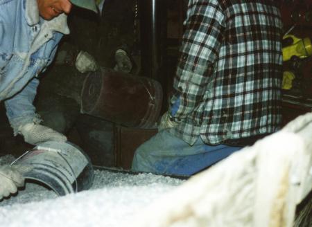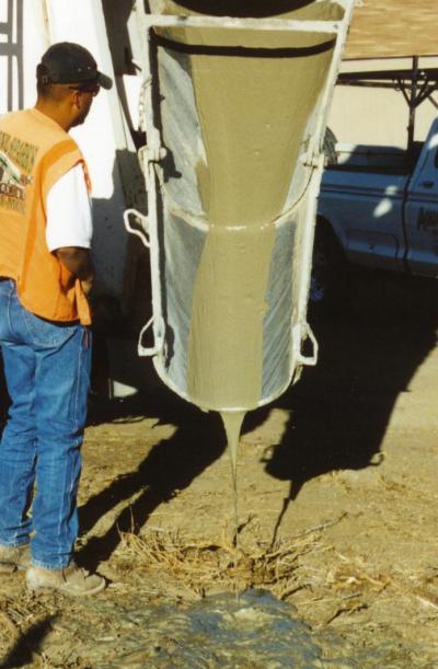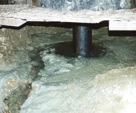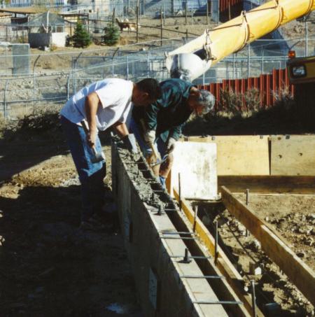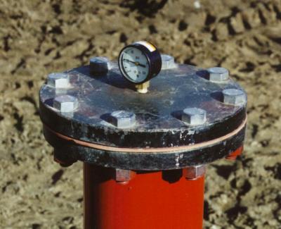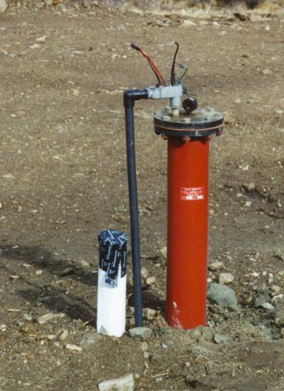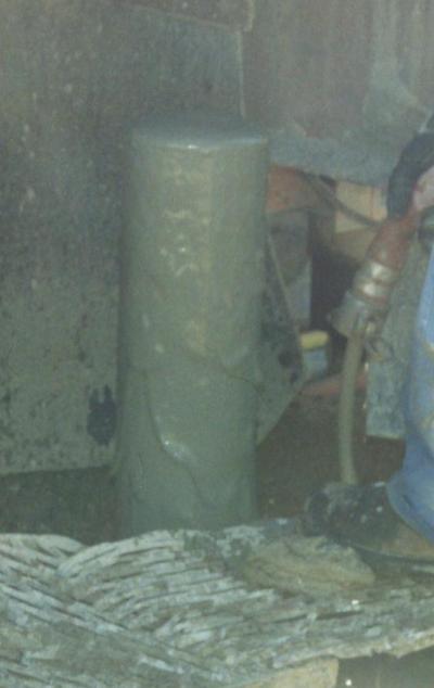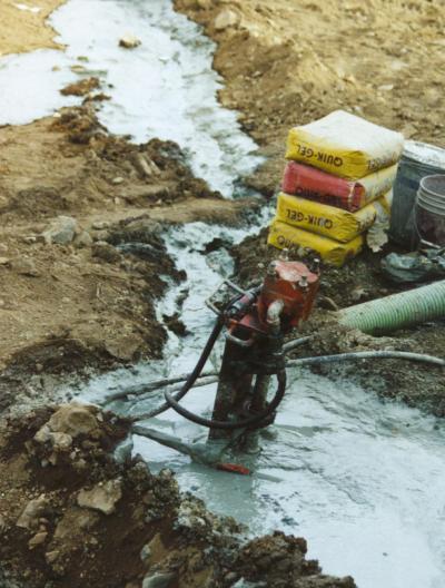 On Saturday, November 17th, the cement seal was poe cement seal was poured around the well. This was done by pumping cement down a pipe to the 100 foot level. The pump used was a double-diaphragm, pneumatically-powered pump. The cement used was 'neat cement', which is pure portland cement (27 bags/yard). When first mixed, the consistency was like thin clay slip. It hardened very quickly, and the crew had to work very fast to get it all in the hole. Even so, the cement constantly hardened in the pumping equipment, requiring frequent stops to clean it out. The artesian pressure in the well was so high that it forced the mud out of the well casing before the concrete was even fully in place. Within an hour or so of pouring the concrete, there was 10 gallons/minute of water gurgling out of the top of the well casing! An attempt will be made on Sunday to cap the well, after the cement has had a chance to harden.