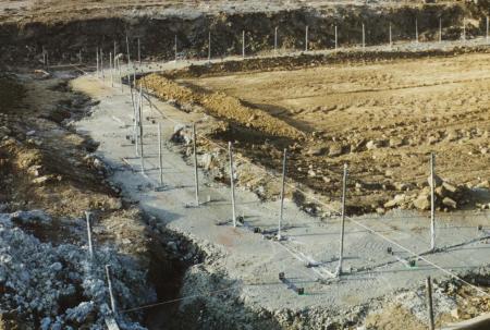 On Wednesday, the J-bolts were set in place in the runners and the stem walls. Just after 1 PM, the concrete was poured for both the runners and the stem walls. On Thursday, the forms came off and loose concrete was trimmed off of everything. Due to some confusion, no man-acess hole was built into the stem wall. That will be cut into the wall after it is determined exactly where it will go. With the concrete pours done, the final site grading was started. This will be a big job, as nearly 2 feetg job, as nearly 2 feet of material must be removed.