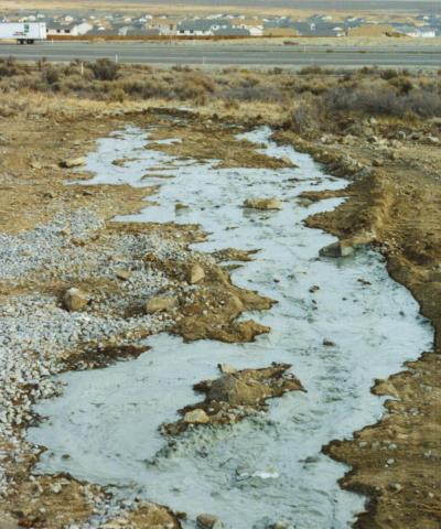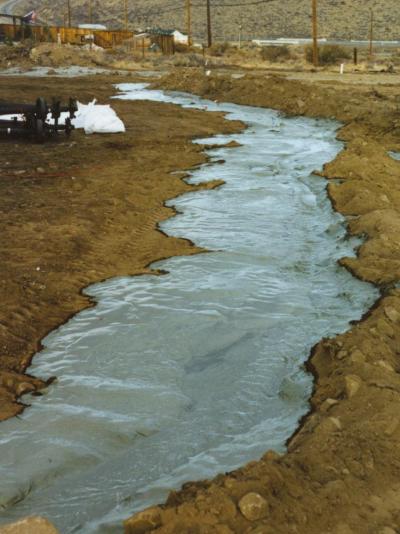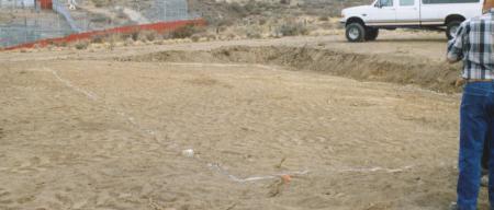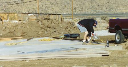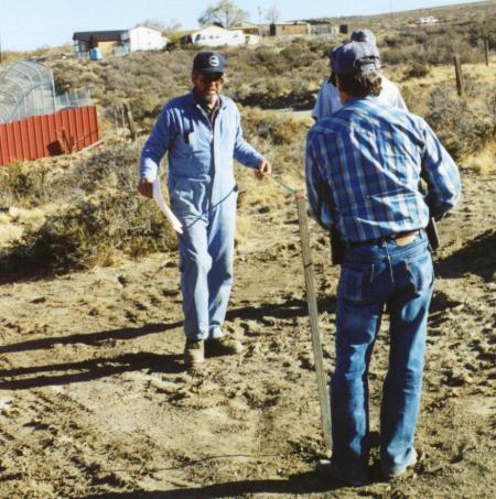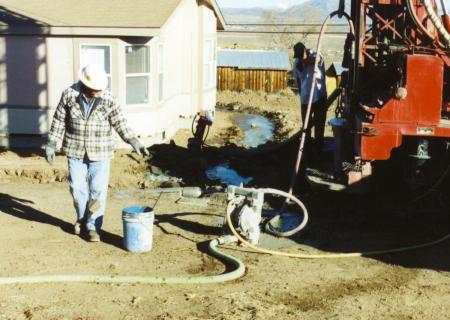 By that morning, the flow from the well was approaching 10 gallons/minute! Here are three views of what I called 'The Lion River'! view1 near well; view2 behind the house; and view3 looking down the center of the property. The drillers quickly discovered the well had collapsed again, ad collapsed again, and the bottom 200 feet were filled with debries. In fact, more material was removed from this part of the well than was originally drilled out of it. The moment that the well was clean, the casing was run down the hole. I unfortunately did not get out to see the casing being welded (It comes in 25 foot sections), but I did arrive just in time to see the last section being driven in to the hole. The fast action getting the casing down was justified, as all but four feet out of 600 feet were sucessfully driven in. This makes the 'official' depth of the well 594 feet. Once the casing was in place, a fine, round gravel (Specially made by the Paiute Indians) was poured into the space between the hole walls and the well casing. By carefully monitoring how much gravel was going in, the crew knew exactly how full the space around the casing was. They also ascertained the fall of the gravel by listening to it tinkle against the casing as it fell deeper. It was kind of eerie to hear this in the relative silence of the evening. (This was done with the drilling rig not running.) The well drilling crew worked well into the evening to get the gravel in so the cement seal could be poured the next day.