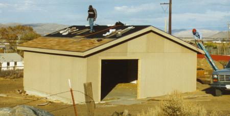 By the end of that week, the garage was complete to the truss rafters. For some reason, probably something to do with concrete hardening time, no more work was done on the house foundation.