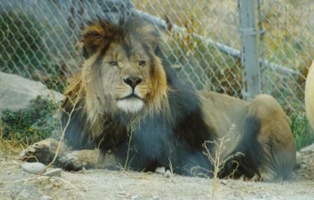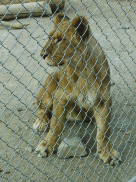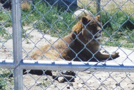 This page wouldn't be complete without a description of my feline neighbors. In the above picture, Kenya the lion looks out over my land from within the zoo. Kenya is the zoo's magnificent male lion, and my favorite animal there. I have spent enough time at the zoo already that Kenya (And lion Jambo) are beginning to get to know me. Kenya is still a young lion,(And still playful!) and his best years are ahead! Here's two pictures of mighty Kenya taking a big stretch! Note his mane covers his entre belly like a carpet. Barbary candidate if I've ever seen one! Picture 1.. Picture 2.