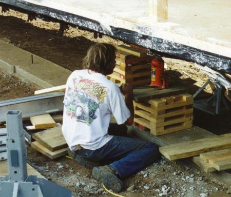 Once the trucks were in place, the axles and towing tongue were removed. Using hand winches, the half section was pulled along the aluminum beams until it was over the foundation. (Here's the South section just starting to move..... then closer..... and closer..... contact!)The section was then lowered onto wooden sleepers, and the aluminum beams removed. Then, using bottle jacksack.jpg">bottle jacks and more sleepers, the section was gently lowered onto the foundation. This was repeated for the other half section. As soon as both sections were in place, the roof was completed to make the structure weathertight. Here's the house as initially set. Here's another view of the house from within the zoo. Over the next several days, the rest of the interoir work will be finished. 28 jackstands were installed under the house to support the main beams. I took a good walk through the house, and found only one minor problem: There was no ceiling light in the study. In many other cases, things were found to be better than expected!
