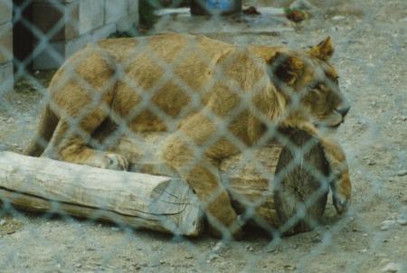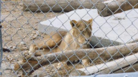 Jambo is the zoo's second male lion, and is son of Kenya and Sierra. He is only a bit over a year old, and is still very much a cub. (Here's a picture of Jambo as a young cub.) Jambo has some health problems that requirh problems that required that he be castrated. As a result, he will never grow a mane. Still full of youthful energy, Jambo loves arranging the logs placed in his cage by the keepers. The keepers have a habit of rearranging his logs on him while cleaning his cage. When Jambo is let back in, he promptly rearranges the logs to his liking!