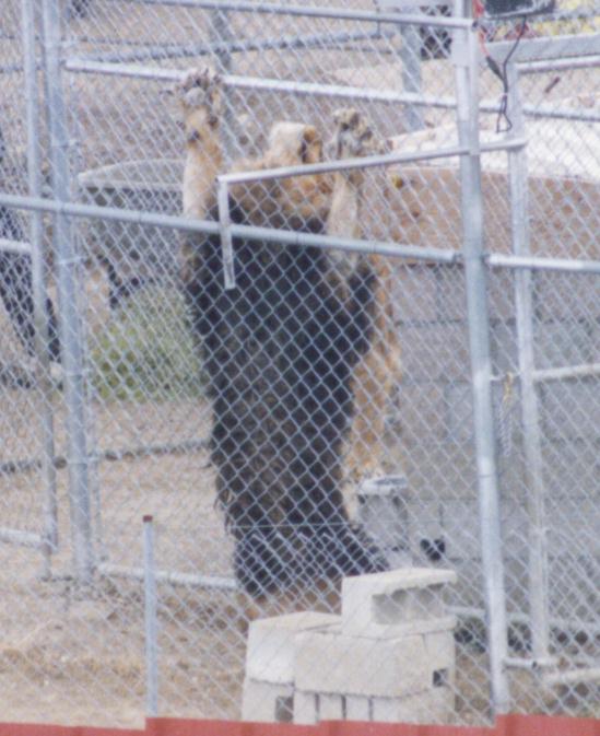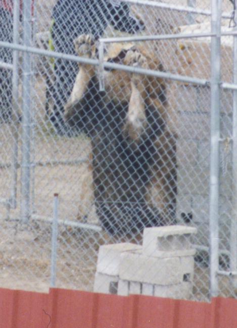 Rocky lion was waiting to see me as we drove over to the big cat compound. Rocky now knows me well, and is usually the first cat to greet me. But, all the cats knew one thing: I had food treats! We gave Detonator tiger and Nala lioness each a big bone. I was allowed to give Kicky cougar a bone through a feeding hole. Kicky was excited and strong. She knocked the bone out of my hand trying to nab it with a claw. She finally got her bone, and ran off with it.
