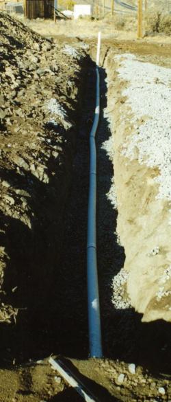 I then dug up the ground in front of the electric service until I found where the water plumbing entered the garage. I carefully determined which pipe went to the well, and which one went to the house. While in the hole, I discovered that the single condoctor run for the well casing heater(!) was directly buried, and not in some sort of conduit. the only way this problem would be corrected is to dig a trench and run new cable. At the same time, I could put in some wiring conduit for monitoring the casing heater and the well pressure. Since the ground was so soft from the thorough soaking we had recieved overnight (I think it was the most rain recieved at one time since I have lived in Nevada.), I gave some thought to digging the trench myself. But, I had to go to someone's house to someone's house for Thanksgiving dinner. That ruled out doing my own digging. But, as the day wore on, I made up plans in my mind for correcting the well tank system shortcomings.