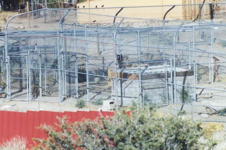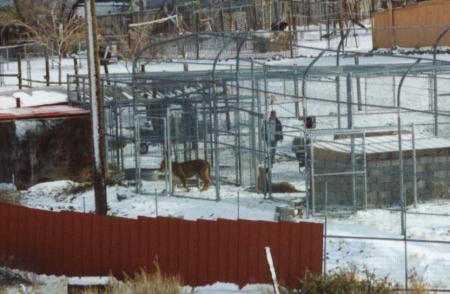 This property turned out to be the sort of things dreams are made of. It was an L-shaped parcel one property to the West of the zoo. The long arm of the L ran from North Virginis St., which is a major street in Reno, and the gravel road known as Trail Drive. The zoo was also located between these roads. Just as in the description, the lot was one lot away from the zoo. But, it was the short arm of the L that was the interesting part. This part of the property extended behind the neighbor's property until it was only a bit over 100 feet from the zoo fence. This intervening land was a fairly deep ravine, and not suitable for any kind of structure. The lay of the land (Which was anything but level!) made this area overlook the entire zoo. But most importantly, this area of closest approach to the zoo exactly corresponded to the lion enclosure. (Can you spot two lions in the enclosure?) So essentially, I would have thlly, I would have the lions to myself!!! (And the rest of the big cats as well!) As if in confirmation of this being a great location, the lions roared for me while I was there!