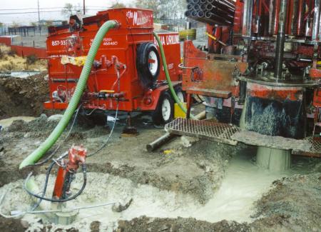 Because the well had partly collapsed over the weekend, the driller had to switch to a 'mud' drilling process. A heavy mud is forced into the borehole through the bit. This does two things. First, it floats up rock powder from the drilling process. Second, the density of the mud helps keep the walls of the hole from collapsing. This process is more time- and equipment- intensive, so it costs more to do. It also is a closed process, and the mud is continuously reused. Unfortunately, the collapsed material is much harder to drill through, so it took the entire day to get back to 300 feet. The good news is that the static level of water in the well Monday morning was 35 feet. This is an encouraging sign, and means we may not be far from water!