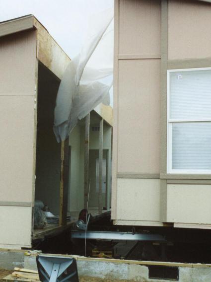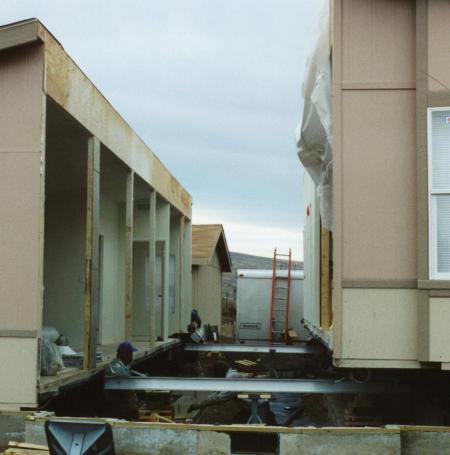 To set the house, the two half sections of the structure were of the structure were placed on either side of the foundation. This was done by a really cool radio controlled tractor called a housecat. The person sitting in this picture is controlling the housecat with a handheld radio control.