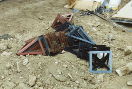 By the end of the following week, the site had been prepared, and the 'pads had been cut' for the house and garage. The next week, the foundation trenches had been dug for the both the house and the garage. The excavation contractor told me that working the extremely rocky soil on this land was like mining! What would normally have taken about a day took nearly a week. An old garbage burner on the property was set aside for future landscape use. Meahwhile, it is doing double duty holding up theaddress sign