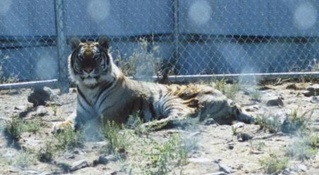 Hobbs is Sierra Safari Zoo's liger. A liger is a cross between a male lion and a female tiger. As a result, ligers are not found in the wildnot found in the wild and are uncommon in captivity. The zoo's oldest cat, Hobbs was born in 1992. For some unknown reason, ligers tend to inherit a double set of size genes, and therefore grow to enormous size. Hobbs weighs in at around 1,000 pounds, more than both of his parents together. (I have been told that 2 of Hobb's littermates are tha largest big cats on record!) Hobbs is a very sweet cat, and loves human attention!