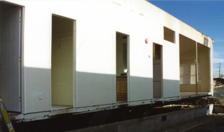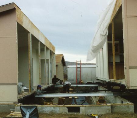 Here's an inside view of the North half and the South half. Each section was then set seperately. To set a half section, two aluminum I-beams were placed under the section while it was still on it's shipping axles. These beams extended over the foundation. The section was then jacked up just enough with hydraulic bottle jacks to put a 'truck' under each of it's main beams. These trucks allowed the structure to move in 2 directions: laterally along the aluminum beam, and at right angles to the aluminum beam. Thus, slight misalignments were easily corrected.