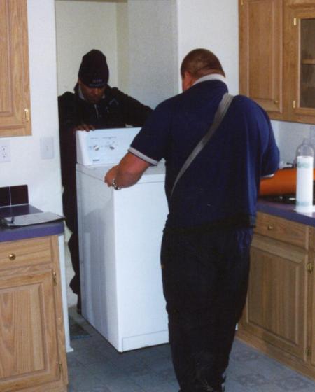 Wednesday, December 26th was a busy day for the project. First of all the washer and dryer were finally delivered. The delivery people used an interesting strap system to move the appliances. In fact, they carried both appliances together when they were outside! I had them just drop off the appliances, so I could hook them up myself.