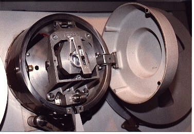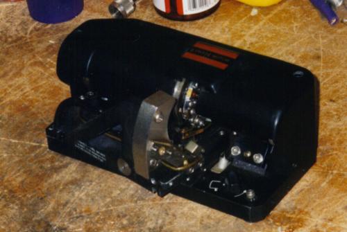Format name: Octaplex SMPTE type: Format type: Analog composite Scanning system: 8 head transverse Year introduced: ? Developer: RCA Was format sucessful? Y NOTE: Was used with an EIA standard 875 line video format of which I have no other information. The tape format is described as ASA C98-1965. Any specs not listed here are probably similar to 5 mil (Half Track) Quadruplex described above. PHYSICAL DATA: Tape width: 2" Tape speed(s): 7.5 ips single channel 15 ips dual channel Tape thickness: as per Quad Playing time(s): (10" reel) 46 min single dual chnl 15 ips. 90 min single channel 7.5 ips. Cassette dimensions: N/A VIDEO: Track length: 1.82" Track width: 5 mil Track angle: Guard band width: 2.8 mil single and dual channel Headwheel diameter: Speed: 1428 RPM (238 RPS) Head-to-tape writing speed: Head azimuth offset angle (one head): No. of segments: ? No. of lines/segment: ? (Frame rate unknown) Control track width: 45 mils Recorded waveform: 238 Hz sine wave --Video modulation or Component luminance channel Sync tip frequency: 7.5 MHz Blanking frequency: Peak white frequency: 10.5 MHz Color carrier frequency: Monochrome only --Component color channel Chroma encoding: Sync tip frequency: Center frequency: Negative peak frequency: Positive peak frequency: --Digital only: Data encoding system: Data rate: Audio segment location: AUDIO: No. of longitudnal channels: 2 Track width: 70/20 mils No. of AFM channels: Carrier frequencies: No. of digital channels: Sampling rate: No. of bits: NOTES: 70 mil (Auxillary 1) track could be used for pulse data, audio+ time code, or audio only. 20 mil (Auxillary 2) track is for pulse data only. TIME CODE: Used a variety of IRIG time codes, multiplexed with audio on the 70 mil (Auxillary 1) longitudnal track. REMARKS: This bizzare format was developed for the military, who needed to record two video signals output from a radar with a time registration of less than a microsecond. The novel solution arrived at was to mount a second set of video heads on a quad scanner! At any given time, two heads were in contact with the tape, each recording a seperate video channel. Therefore, every other track belonged to one video signal. It was used to record an oddball, 875 line wideband (6 MHz) video format. I have two scanners for these machines; a machine is being sought after. Other than the eight heads, and a improved guide servo motor, the heads look like conventional ball-bearing quad heads of RCA design. I have good reason that this system was used during the Persian Gulf War. It is still being used today (3-99) for some FAA radar projects.Click here for a picture of an Octaplex head.