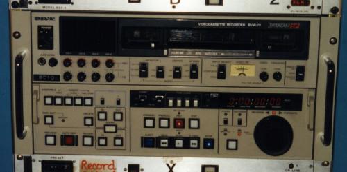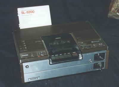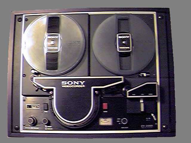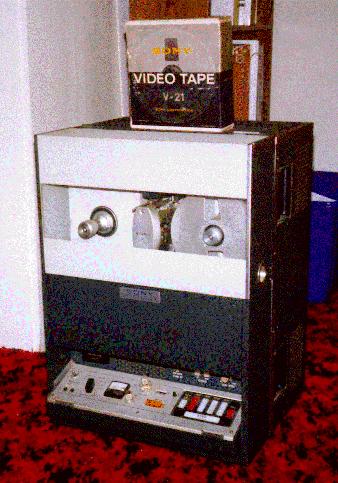 Format name: Sony 2 head helical SMPTE type: Format type: analog Scanning system: 2 head helical Year introduced: 1972? Developer: Sony Was format sucessful? Y [All figures are for NTSC, 525/60/2:1, unless noted.] PHYSICAL DATA: Tape width: Tape speed(s): Tape thickness: Playing time(s): 63 min w/2,460 ft. tape Cassette dimensions: VIDEO: Track length: Track width: Track angle: 3.966 deg. Guard band width: Headwheel diameter: Speed: 198.8 mm/sec Head-to-tape writing speed: 15 meters/sec. Gap width: Head azimuth offset angle (one head): No. of segments: No. of lines/segment: Control track width: Recorded waveform: --Video modulation or Component luminance channel Sync tip frequency: 2.5 MHz Blanking frequency: Peak white frequency: 4.9 MHz Color carrier frequency: --Component color channel Chroma encoding: Sync tip frequency: Center frequency: Negative peak frequency: Positive peak frequency: --Digital only Data encoding system: Data rate: Audio segment location: AUDIO: No. of longitudnal channels: 2 Track width: No. of AFM channels: Carrier frequencies: No. of digital channels: Sampling rate: No. of bits: TIME CODE: REMARKS: I have two of these in my collection, a model EV-200 and a EV-310. I know very little about them, other than the fact they use a two-head, halfwrapped tape format. It is the only 2-head one-inch machine I have ever personally seen. Despite being built in the early 70's, the EV-200 uses tubes in the motor drive amplifier! It is rumored that a color adaptor was available for this format, called the CLP-1B. The two audio channels are also in odd places: One above the video area and one below. The EV-310 I have may be in operational condition, but I haven't had time to work on it, yet. One misconception that I have recently officially cleared up: The EV-2XX and EV-3XX machines are the same format, and tapes may be freely interchanged between them.Click here for a picture of a Sony 2 head 1 inch VTR.