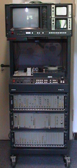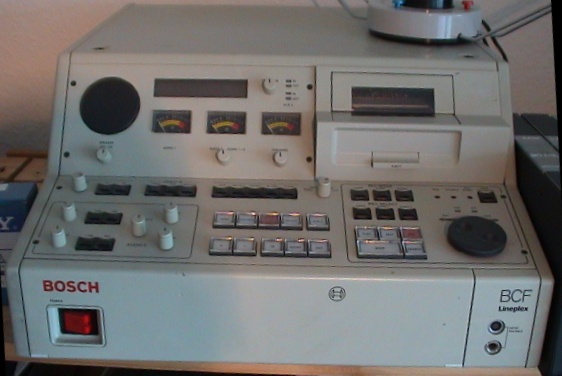 Format name: Lineplex (Quartercam) SMPTE type: Format type: analog Scanning system: helical Year introduced: 81 Developer: Bosch Was format sucessful? N [All figures are for PAL, 625/50, unless noted.] PHYSICAL DATA: Tape width: 1/4" Tape speed(s):11.8 cm/s Tape thickness: Playing time(s): Cassette dimensions: VIDEO: Track length:94.24 mm Track width: 55 microns Track angle: 2.7 deg Guard band width: ? Headwheel diameter: 60 mm Speed:25 1/s (?) Head-to-tape writing speed: 4.71 m/s Head azimuth offset angle (one head): No. of segments: No. of lines/segment: Control track width: Recorded waveform: --Video modulation or Component luminance channel Sync tip frequency: 3.82 -> 2.55 MHz (expanded) Blanking frequency: Peak white frequency: 5.39 -> 3.59 MHz (expanded) Color carrier frequency: Luminance is FM recorded following Time-expansion. --Component color channel Chroma encoding: Sync tip frequency: Center frequency: Negative peak frequency: Positive peak frequency: --Digital only Data encoding system: Data rate: Audio segment location: AUDIO: No. of longitudnal channels: 2 Track width: 0.35 mm No. of AFM channels: Carrier frequencies: No. of digital channels: Sampling rate: No. of bits: TIME CODE: 1 Track, 0.3 mm REMARKS: This apparently was an experimental portable VTR developed for electronic news gathering (ENG). Whatever it was, it never caught on. For this system, an analogue data-compression system was developed, using time-expansion for Y, time compression for C and multiplexing Y and C on two tracks. This system was also known as Quartercam.Click here for a picture of a Lineplex VTR. Thanks, Klaus Carstens!