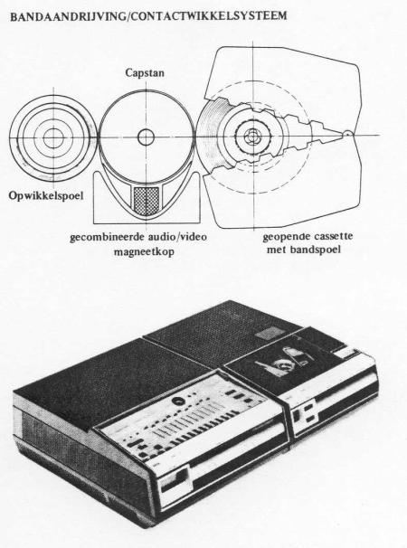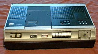 Format name: VCR Standard SMPTE type: Format type: analog Scanning system: 2 head half wrap helical Year introduced: 1972 Developer: Philips/Grundig Was format sucessful? Y [All figures are for PAL, 625/50/2:1, unless noted.] PHYSICAL DATA: Tape width: 1/2" Tape speed(s): 14.29 cm/sec Tape thickness: Playing time(s): 60 min (VC60 cassette) Cassette dimensions: A cassette with coaxial reels was used VIDEO: Track length: 165 mm Track width: 130 micron Track angle: 3 deg 41 min Guard band width: 57 micron (Track pitch 187 micron) Headwheel diameter: 105 mm Speed: 1500 RPM Head-to-tape writing speed: 8.1 m/sec Gap width: Head azimuth offset angle (one head): Not employed No. of segments: No. of lines/segment: Control track width: .3 mm Recorded waveform: --Video modulation or Component luminance channel Sync tip frequency: 3 MHz Blanking frequency: Peak white frequency: 4.4 MHz Color carrier frequency: 562.5 kHz --Component color channel color under Chroma encoding: Sync tip frequency: Center frequency: Negative peak frequency: Positive peak frequency: --Digital only Data encoding system: Data rate: Audio segment location: AUDIO: No. of longitudnal channels: 2 Track width: .7 mm (both tracks) No. of AFM channels: Carrier frequencies: No. of digital channels: Sampling rate: No. of bits: TIME CODE: REMARKS: An apparently popular early European cassette format. It was the first of a family of incompatible standards that used the same coaxial cassette. See 'VCR Long Play' and 'Supervideo' in the following sections for details on the derivitave formats. Note that though this format and it's derivitives had two audio channels specified, few, if any machines actually used both channels. Representative machines for this format were the Philips N1500 and N1502. The N1500 was the first true 'consumer' VTR, featuring a tuner-timer. Also, this machine represented the first use of the term 'VCR'.Click here for a picture of a Philips N1500 VCR. Photo Credit: Michael Bennett. Used by permission.