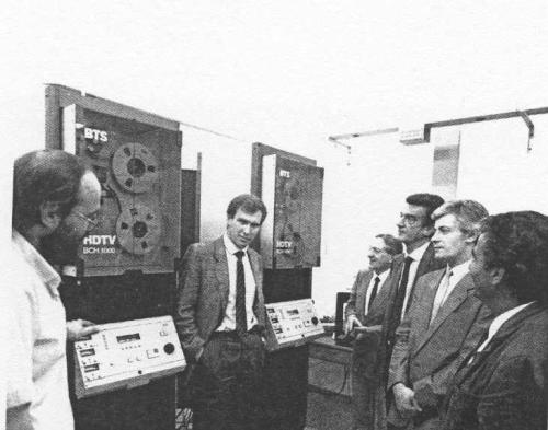 Format name: BTS BCH-1000 SMPTE type: Format type: Analog component Scanning system: helical Year introduced: ? 1987 Developer: BTS Sucessful? N [All figures are for HDTV, 1250/50/2:1, unless noted.] PHYSICAL DATA: Tape width: 1" Tape speed(s): 66.1 cm/sec Tape thickness: Playing time(s): 60 Minutes, 12.5 inch reel Cassette dimensions: Open reel VIDEO: Track length: 82.75 mm Track width: 85 um Track angle: 15.556 deg. Guard band width: 15 um Headwheel diameter: 50.33 mm Speed: 12,000 RPM Head-to-tape writing speed: 32 meters/sec Head azimuth offset angle (one head): No. of segments: 4/field No. of lines/segment: 156.25 Control track width: .4 mm Recorded waveform: Square wave --Video modulation or Component luminance channel (2 luma tracks/scan) Sync tip frequency: 12 MHz Blanking frequency: 15 MHz Peak white frequency: 25 MHz Color carrier frequency: --Component color channel Chroma encoding: (Seperate tracks for Cr and Cb) Sync tip frequency: 12 MHz Blanking frequency: 15 MHz Peak level frequency: 25 MHz --Digital only Data encoding system: Data rate: Audio segment location: AUDIO: No. of longitudnal channels: 3 (One is used for time code) Track width: .8 mm No. of AFM channels: Carrier frequencies: No. of digital channels: Sampling rate: No. of bits: TIME CODE: Yes, longitudnal, SMPTE/EBU compliant REMARKS: An early attempt at an HDTV VTR. I was lucky enough to see one of these at the 1987 NAB. It uses a scanner similar in size to type B. The scanner rotates at a higher speed than type B. (12,000 RPM vs 9,000 RPM) There are eight video heads and two erase heads on the scanner. The video heads are arranged in two groups of four, and the tape record made by one set of four heads is considered a single track. The four heads lay down low frequency luma, high frequency luma, Color component Cr, and color component Cb. The effective luma bandwidth is 20 MHz, and the color component channels are each 10 MHz. Digital processing is used to develop the low and high frequency luma channels. Signal to noise ratio is better than 40 dB in all three component channels, quite an accomplishment for these bandwidths. The control track includes framing pulese as well as the 200 Hz servo reference signal. The audio tracks are quite conventional, and similar to type B. All of this information and the picture below were provided by Marcel Snijders. Expect more info as I translate the information he provided from Dutch!Click here for a picture of a BCH-1000.