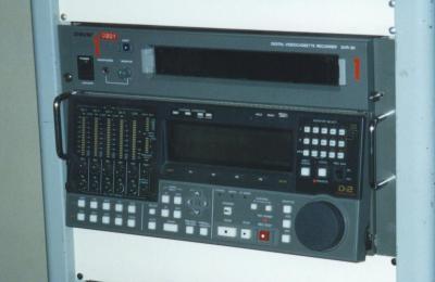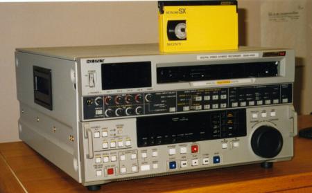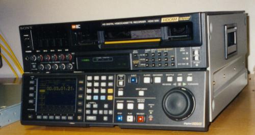 Format name: 1" HDTV digital 'HDD-1000' SMPTE type: Format type: digital Scanning system: multiple head segmented helical scan Year introduced: 1993 Developer: Sony Was format sucessful? Y [All figures are for HDTV, 1125/60/2:1, unless noted.] PHYSICAL DATA: Tape width: 1" Tape speed(s): Tape thickness: Playing time(s): Cassette dimensions: N/A VIDEO: Track length: Track width: Track angle: Guard band width: Headwheel diameter: Speed: Head-to-tape writing speed: Gap width: Head azimuth offset angle (one head): No. of segments: No. of lines/segment: Control track width: Recorded waveform: --Video modulation or Component luminance channel Sync tip frequency: Blanking frequency: Peak white frequency: Color carrier frequency: --Component color channel Chroma encoding: Sync tip frequency: Center frequency: Negative peak frequency: Positive peak frequency: --Digital only Data encoding system: Data rate: 1.25 GBits/sec Audio segment location: AUDIO: No. of longitudnal channels: 1 Track width: No. of AFM channels: Carrier frequencies: No. of digital channels: 8 Sampling rate: No. of bits: TIME CODE: Probably a seperate time code track. REMARKS: This was the highest performance VTR ever built until D6 came along. It can digitally record three channels of video with a bandwidth of 30 MHz on metal particle tape. Not many of these machines have been made, but I have been lucky enough to have seen one in use on several occasions! A scanner rebuild is alleged to cost upwards of $45,000!