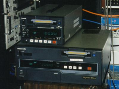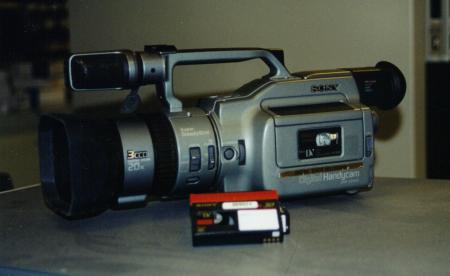 Format name: DV or DVC SMPTE type: Format type: digital component Scanning system: multi head helical scan Year introduced: 1996 Developer: EIAJ Was format sucessful? ? [All figures are for NTSC, 525/60/2:1, unless noted.] PHYSICAL DATA: Tape width: 6.35 mm Tape speed(s): 18.831 mm/sec. Tape thickness: 8.8 microns Playing time(s): approx. 3 1/2 hr (Large Cassette) Cassette dimensions: Small: ? Large: 4 15/16 X 3 X 9/16 in. VIDEO: Track length: Track width: Track angle: Guard band width: Headwheel diameter: 21.7 mm Speed: 9000 rpm Head-to-tape writing speed: 9.9 m/sec Head azimuth offset angle (one head): 20 deg. No. of segments: 10 No. of lines/segment: 26.2 Control track width: none used Recorded waveform: --Video modulation or Component luminance channel Sync tip frequency: Blanking frequency: Peak white frequency: Color carrier frequency: --Component color channel Chroma encoding: Sync tip frequency: Center frequency: Negative peak frequency: Positive peak frequency: --Digital only Sampling rate: Y: 13.5 MHz; R-Y, B-Y:3.375 MHz No. of bits: 8 5:1 DCT-based video compression Data encoding system: Data rate: 25 Mb/Sec. Audio segment location: End of track AUDIO: No. of longitudnal channels: none Track width: No. of AFM channels: Carrier frequencies: No. of digital channels: 2 Sampling rate: 48 KHz No. of bits: 16, or, 4 channels at 32 kHz, 12 bits. TIME CODE: Yes, recorded in a segment with video and audio. REMARKS: This is the new consumer digital format. Although it uses 5:1 compression, this format should deliver pictures that we would have called full broadcast quality ten years ago. Numerous companies have worked together to make DVC a reality. Although the format was slow to catch on, it is now selling well in the consumer market. There is also rumors that there are now multiple tape speeds for this format, the longer-playing one featuring a track spacing of 7.7 microns.Click here for a picture of a consumer DV camcorder.