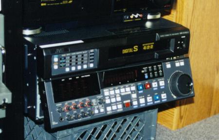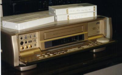 Format name: W-VHS SMPTE type: Format type: analog component Scanning system: 2 head helical Year introduced: 1995 (1984?) Developer: JVC Was format sucessful? Y [All figures are for HDTV, 1125/60/2:1, unless noted.] PHYSICAL DATA: Tape width: 1/2" Tape speed(s): Tape thickness: Playing time(s): Cassette dimensions: Same as VHS/S-VHS. VIDEO: Track length: Track width: Track angle: Guard band width: Headwheel diameter: Speed: Head-to-tape writing speed: Head azimuth offset angle (one head): No. of segments: No. of lines/segment: Control track width: Recorded waveform: --Video modulation or Component luminance channel Sync tip frequency: Blanking frequency: Peak white frequency: Color carrier frequency: --Component color channel Chroma encoding: Sync tip frequency: Center frequency: Negative peak frequency: Positive peak frequency: --Digital only Data encoding system: Data rate: Audio segment location: AUDIO: No. of longitudnal channels: 2 Track width: No. of AFM channels: Carrier frequencies: No. of digital channels: Sampling rate: No. of bits: TIME CODE: ? REMARKS: This is an interesting analog HDTV format. It was introduced several years back, and never seemed to do much. Now, with DTV just around the corner, W-VHS is becoming the 'VHS' of the HDTV world. There are even serious videophiles using the inexpensive (~$8,000) machines in high-end home theater installations! Apparently, laboratories have been using this format for instrumentation recording for some years. These machines also record and play standard and S-VHS. Little is known about W-VHS's apparently novel recording system, but it appears to use a form of frame interleaving. It is also rumored that Digital-S (D-9) cassettes can be used in these machines, and are much less expensive than the 'W-VHS' branded cassettes.Click here for a picture of a W-VHS VTR.