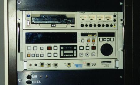 Format name: Betacam SP (or beta SP) SMPTE type: L Format type: analog component Scanning system: 2 head helical Year introduced: 1986 Developer: Sony Was format sucessful? Y [All figures are for NTSC, 525/60/2:1, unless noted.] PHYSICAL DATA: Tape width: 1/2" Tape speed(s): 4.67 ips Tape thickness: .55 mils metal particle Playing time(s): 31/94 minutes (Small, Large cassettes) Cassette dimensions: Small: 156 X 96 X 25 mm Large: VIDEO: Track length: Track width: 3.39 mils (Y) Track angle: 4.603 deg 2.87 mils (C) Guard band width: .22 mils Headwheel diameter: 2.93" Speed: 1800 rpm Head-to-tape writing speed: 276.2 ips Head azimuth offset angle (one head): No. of segments: 1 No. of lines/segment: Control track width: Recorded waveform: square wave --Video modulation or Component luminance channel Sync tip frequency: 5.7 MHz Blanking frequency: 6.27 MHz Peak white frequency: 7.7 MHz Color carrier frequency: --Component color channel Chroma encoding: CTDM R-Y, B-Y Sync tip frequency: 6.35 MHz Center frequency: 5.3 MHz Negative peak frequency: 5.8 MHz Positive peak frequency: 4.8 MHz --Digital only N/A Data encoding system: Data rate: Audio segment location: AUDIO: No. of longitudnal channels: 2 Track width: 23.62 mils No. of AFM channels: 2 Carrier frequencies: 310 kHz, 540 kHz No. of digital channels: N/A Sampling rate: No. of bits: TIME CODE: Seperate longitudnal time code track + VITC. REMARKS: Beta SP is the current de facto broadcast industry standard. It is a 'hi-banded' Betacam, using metal particle tape, higher modulation frequencies, and has 2 AFM audio channels in addition to the longitudnal channels. The fact that this format has become a standard is remarkable in the fact that Sony is the only supplier of transports for this format. There are three grades of Betacam SP machines available: the pro broadcast BVW series, the hi-end industrial PVW series, and the low end industrial UVW series. They differ markedly in the quality of their construction, with the PVW machines seeming to be the least well built. The PVW machines also use an 'M' tape wrap, while the other machines are U-wrap.Click here for a picture of a Beta SP VTR.
