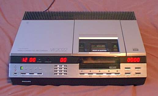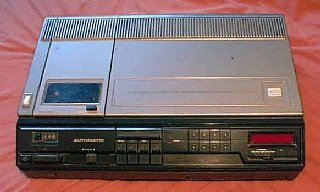 Format name: VCR Longplay SMPTE type: Format type: analog Scanning system: helical Year introduced: 1975 Developer: Philips/Grundig Was format sucessful? Y [All figures are for PAL, 625/50/2:1, unless noted.] NOTE: See 'VCR Standard' above for most details. Only the differences are noted here. PHYSICAL DATA: Tape width: 1/2" Tape speed(s): 6.56 cm/sec. Tape thickness: Playing time(s): 130 min (VC60 cassette) Cassette dimensions: A cassette with coaxial reels was used VIDEO: Track length: Track width: Track angle: Guard band width: Headwheel diameter: Speed: Head-to-tape writing speed: Gap width: Head azimuth offset angle (one head): Azimuth recording was used. No. of segments: No. of lines/segment: Control track width: Recorded waveform: --Video modulation or Component luminance channel Sync tip frequency: Blanking frequency: Peak white frequency: Color carrier frequency: ? --Component color channel color under Chroma encoding: Sync tip frequency: Center frequency: Negative peak frequency: Positive peak frequency: --Digital only Data encoding system: Data rate: Audio segment location: AUDIO: No. of longitudnal channels: 1 Track width: No. of AFM channels: Carrier frequencies: No. of digital channels: Sampling rate: No. of bits: TIME CODE: REMARKS: A derivitive of 'VCR Standard', it was incompatible, thus it's listing as a seperate format. (The same coaxial cassete was employed, however.) It featured more than double the playing time over 'VCR Standard'. This was acheived by halving the tape speed and employing azimuth recording. A representitive model of this format is the Philips N1700.Click here for a picture of a Philips N1700 VCR. Photo credit: Michael Bennett. Used By permission.
