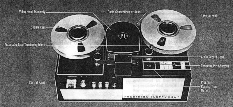 Format name: Precision Instruments PI-3V SMPTE type: Format type: analog composite Scanning system: 2 head helical Year introduced: 1963 Developer: Precision Instruments Sucessful? ? [All figures are for NTSC, 525/60/2:1, unless noted.] PHYSICAL DATA: Tape width: 1" Tape speed(s): 7.5 in/sec Tape thickness: Playing time(s): 96 min, 10.5" reel Cassette dimensions: VIDEO: Track length: Track width: Track angle: Guard band width: Headwheel diameter: Speed: Head-to-tape writing speed: Head azimuth offset angle (one head): No. of segments: No. of lines/segment: Control track width: Recorded waveform: --Video modulation or Component luminance channel Sync tip frequency: Blanking frequency: Peak white frequency: Color carrier frequency: --Component color channel Chroma encoding: Sync tip frequency: Center frequency: Negative peak frequency: Positive peak frequency: --Digital only Data encoding system: Data rate: Audio segment location: AUDIO: No. of longitudnal channels: 1, maybe 2 Track width: No. of AFM channels: Carrier frequencies: No. of digital channels: Sampling rate: No. of bits: TIME CODE: ? REMARKS: One of the first 1" industrial VTR's. Precision Instruments was apparently a major manufacturer of instrumentation recorders in the early '60's. The brocure for the machine mentions recorders built for spacecraft. The machine appears well designed with refrence to plug-in cards and a cast aluminum frame. Very little else is known about the machine or format.Click here for a picture of a Precision Instruments PI-3V.