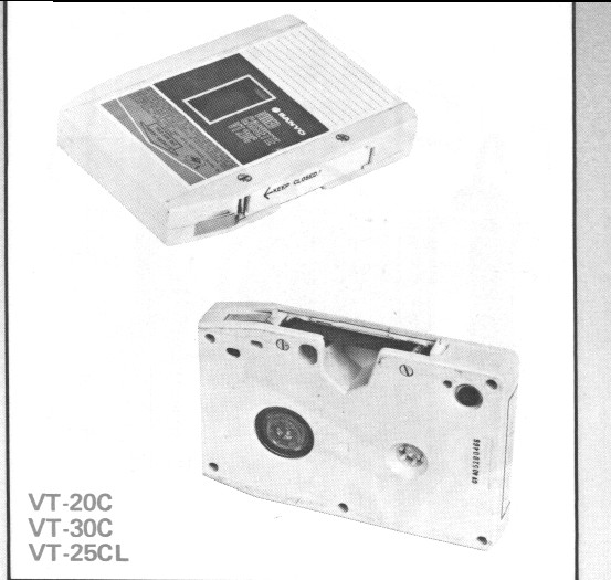 Format name: V-Cord, V-cord II SMPTE type: Format type: analog Scanning system: 2 head helical scan Year introduced: ? Developer: Sanyo Was format sucessful? ? [All figures are for NTSC, 525/60/2:1, unless noted.] PHYSICAL DATA: Tape width: 1/2" Tape speed(s): 11.47 cm/sec Hi, 5.74 cm/sec Lo Tape thickness: 27 and 20 um Playing time(s): 36 min, high speed with VT-30C cassette. Double the time for low speed on VTC-7300. VT-20C gave 24 minutes playing time and used thicker tape. Cassette dimensions: 108 X 25 X 156 mm. VIDEO: Track length: Track width: Track angle: Guard band width: Headwheel diameter: Speed: Head-to-tape writing speed: Head azimuth offset angle (one head): No. of segments: No. of lines/segment: Control track width: Recorded waveform: --Video modulation or Component luminance channel Sync tip frequency: Blanking frequency: Peak white frequency: Color carrier frequency: --Component color channel Chroma encoding: Sync tip frequency: Center frequency: Negative peak frequency: Positive peak frequency: --Digital only Data encoding system: Data rate: Audio segment location: AUDIO: No. of longitudnal channels: 1 Track width: No. of AFM channels: Carrier frequencies: No. of digital channels: Sampling rate: No. of bits: TIME CODE: Not used. REMARKS: V-Cord II is a cassette-based VTR format that bore a lot of similarities to EIAJ II, but was apparently not the same. There also seems to be two versions of this format: V-cord and V-cord II. I do not know the difference between these variants. I have worked on a couple of these that were part of a medical ultrasound scanner. The VTC-7300 apparently had two tape speeds, allowing double record time. These machines also featured a second set of heads for slow motion.Click here for a picture of a portable V-Cord Machine. Thanks, Klaus Carstens!