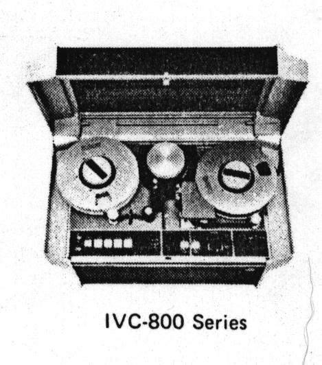 The IVC 800 was a basic record/play machine, and was also the first machine marketed under the IVC brand name. It does not employ a capstan servo, but it did have a solenoid-operated tape transport. It was therefore remote-controllable. It also featured a built-in audio amplifier and speaker. List price circa 1970 was $3,000. The IVC 800A had the following improvements: Connectors on rear instead of bttom; New servo board, improved modulator, power supply, and preamp. There were some other minor differences.